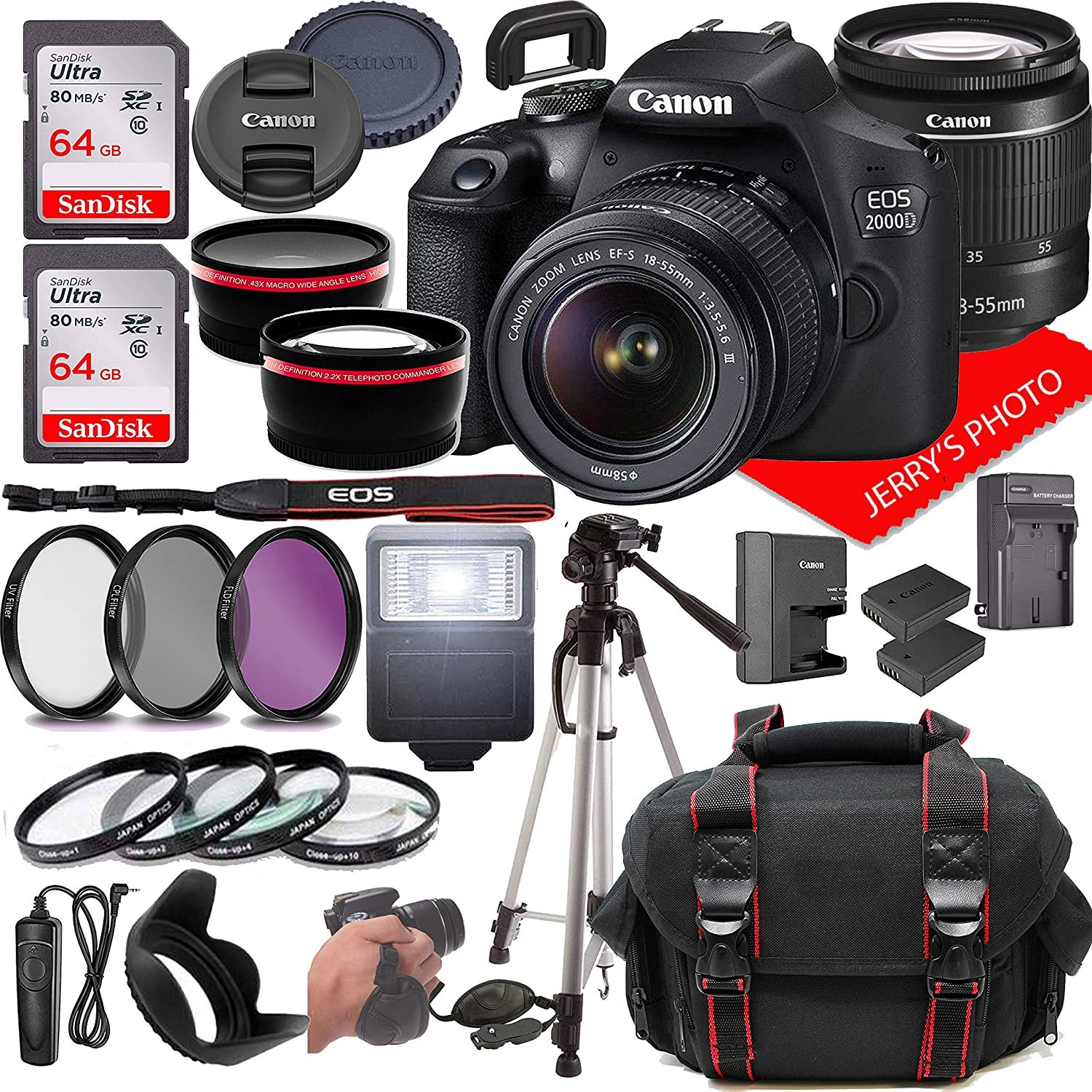 • This Jerry’s Photo DSLR Camera Package Includes 2 X Sandisk 64GB Class 10 SD Memory Cards ,USB Card Reader ,58mm 3 Piece Filter Kit , 58mm 4 Piece Macro Kit ,58mm .43 Wide Angle Lens, 58mm 2.2x Telephoto Lens, 58mm Tulip Hood 50 inch DSLR Tripod, Battery Charger ,Spare High Capacity Battery , Spare travel Charger ,Wired Remote Shutter, Slave Flash, Lens Caps , And Body Cap ,Neck Strap , Jerry’s Photo Lens Cleaning Cloth ,Camera Gadget Bag + 1 Year Seller Supplied Warranty , And Includes :